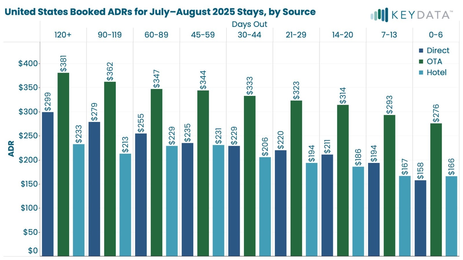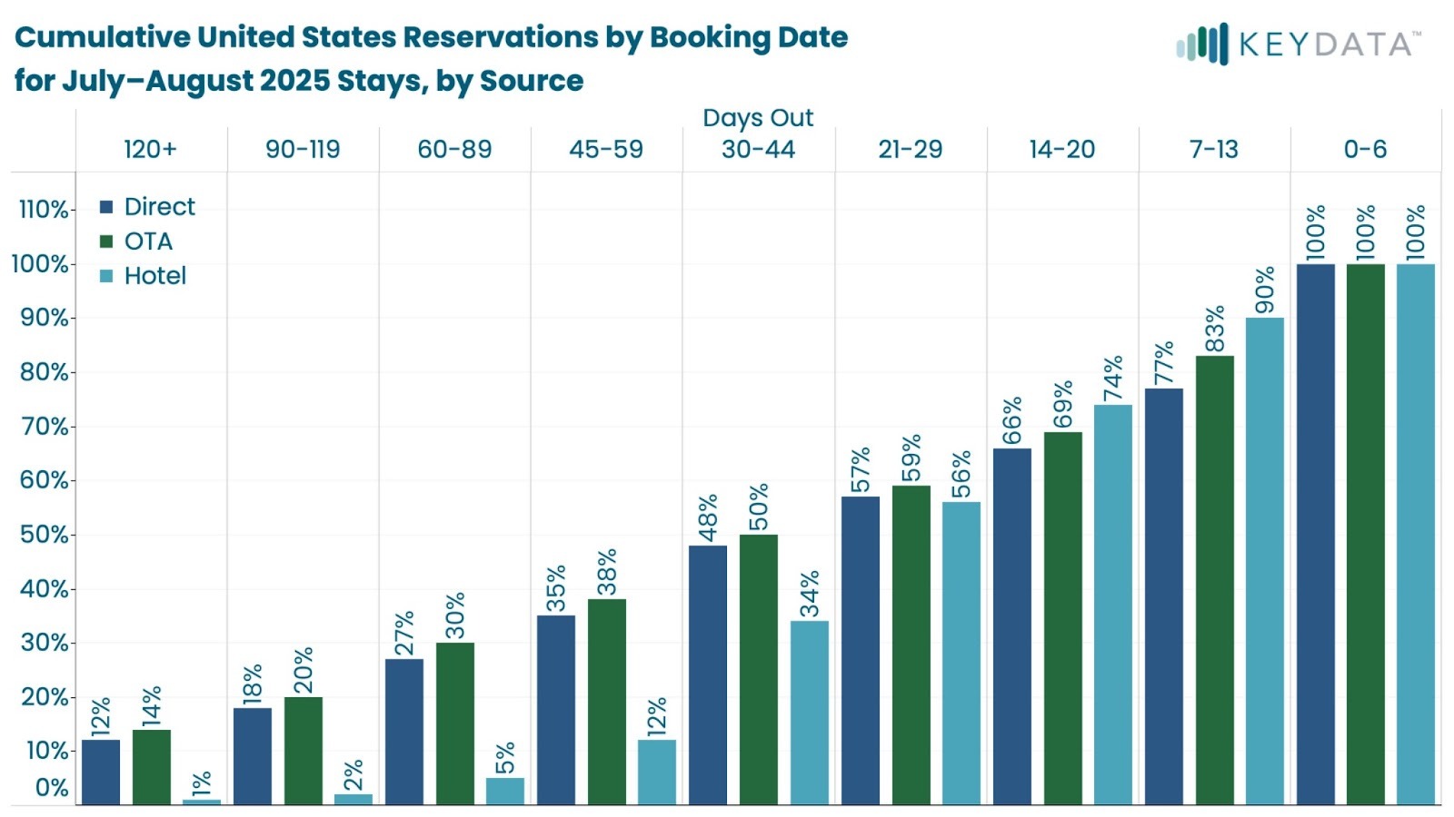 For July–August 2025 stays, hotels have booked approximately 34% of their reservations by 30–44 days out, while short-term rentals have already reached 48%. At that same lead time, Direct bookings average $23 higher ADR than hotel bookings.