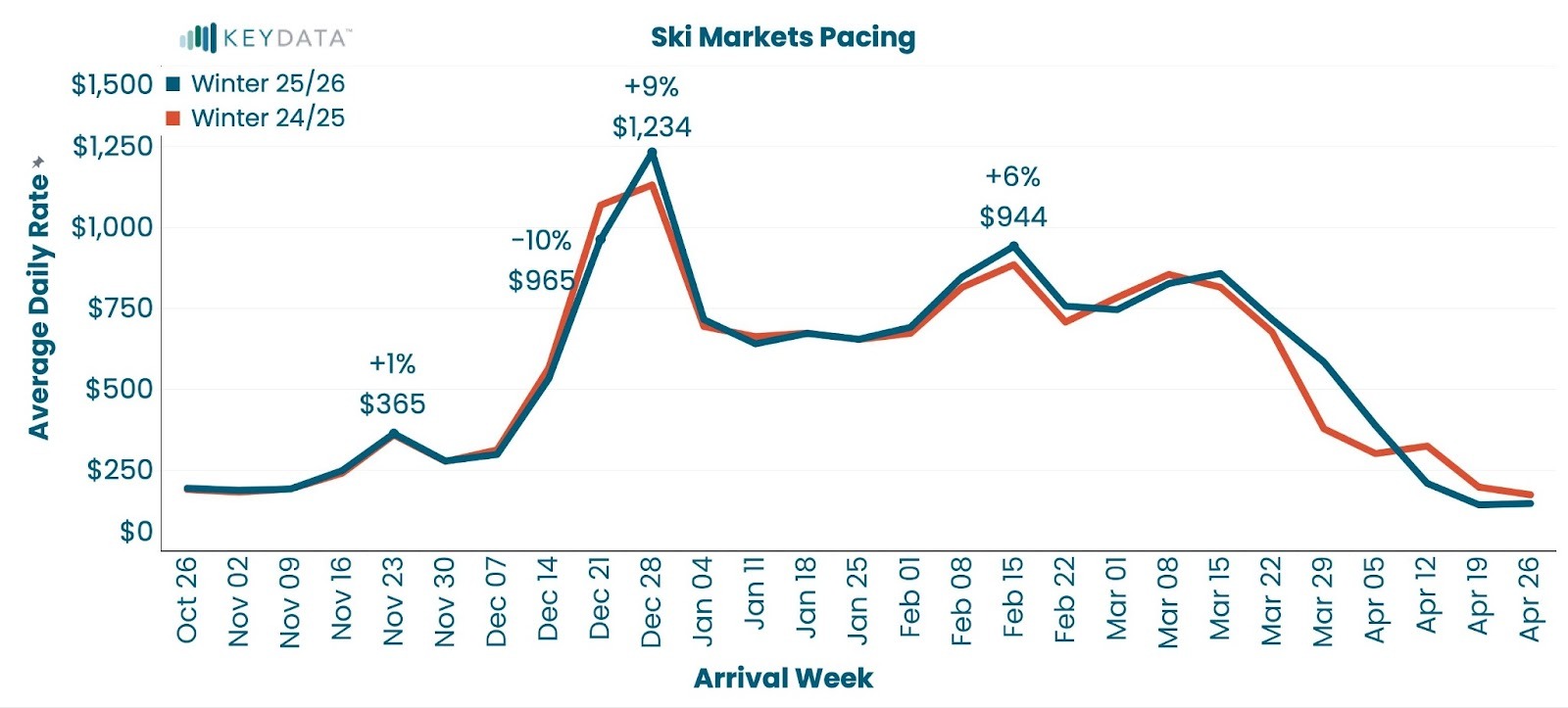 While New Year’s Week (+9% YoY) and Presidents’ Week (+6%) are pacing well ahead of last year, Christmas rates are trending lower (-10%), and Thanksgiving remains steady YoY. With occupancy pacing higher across the entire ski season, property managers have an opportunity to leverage this increased demand by optimizing pricing strategies to capture stronger revenue performance.