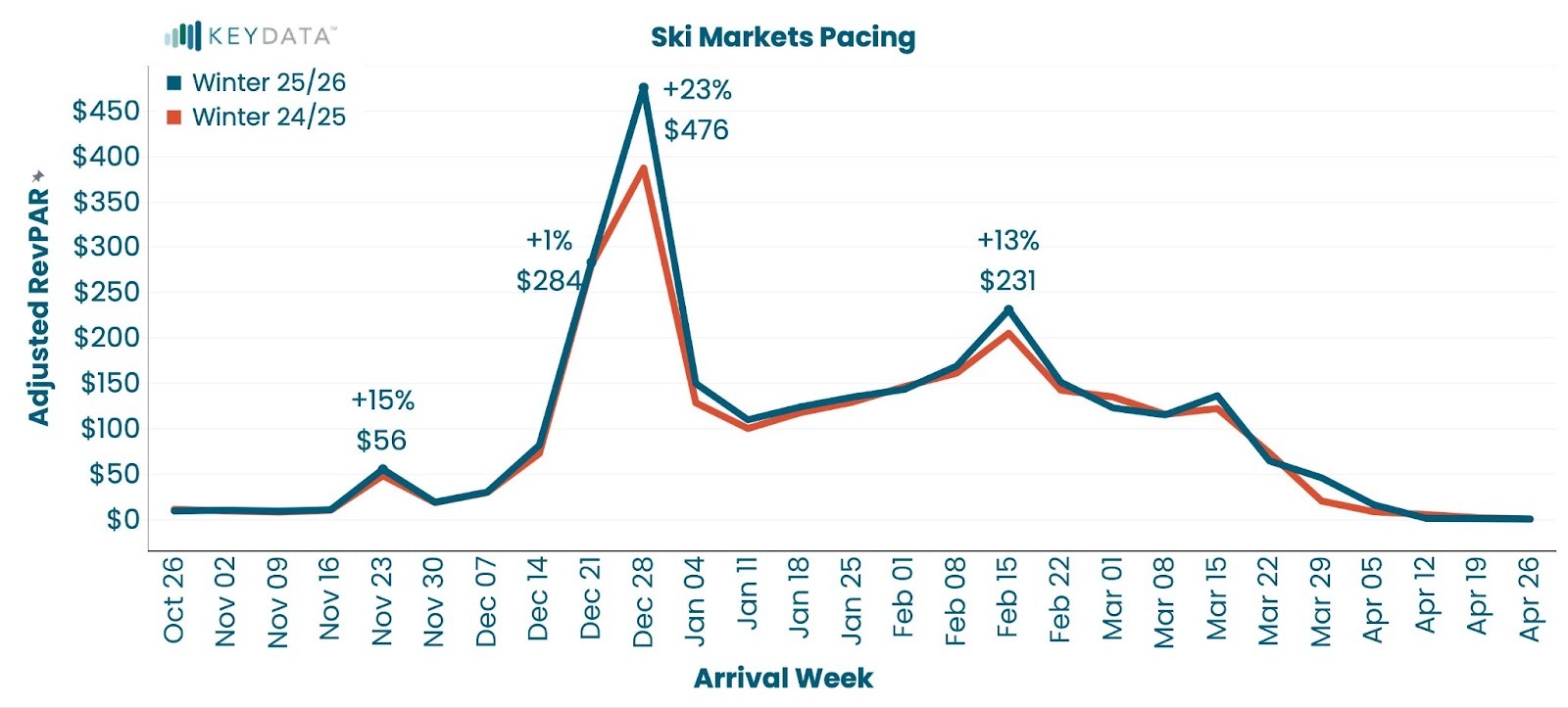 Higher occupancy and stronger rates are translating directly into higher overall revenues across ski markets. Thanksgiving week revenues per property are pacing 15% higher than last year, driven by steady demand and early-season rate growth. New Year’s Week stands out as the top performer, with revenues pacing 23% ahead of 2024–2025, reflecting both robust pricing and near-capacity booking levels in many destinations.