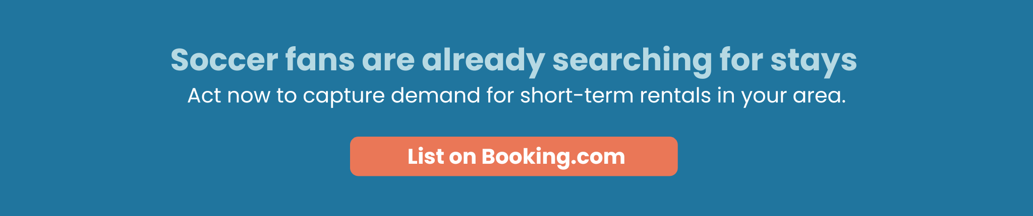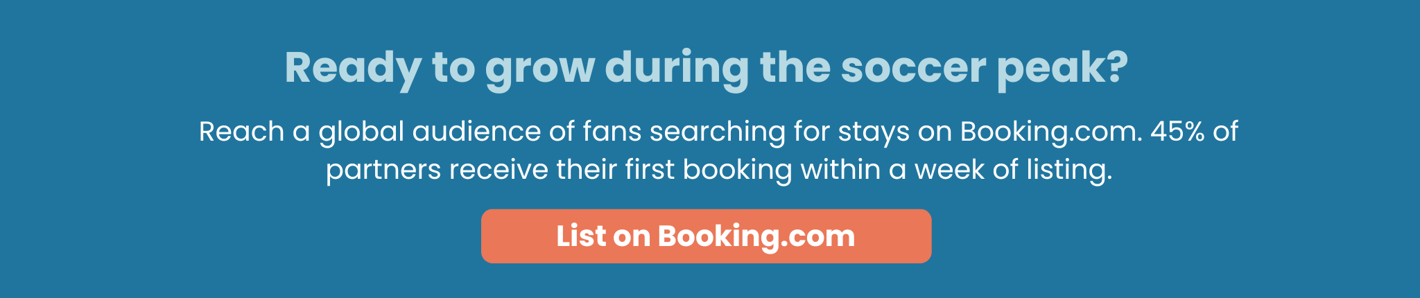 In addition, soccer travelers don’t book just lodging, they book full itineraries. Booking.com is increasingly the platform where guests plan everything: flights, car rentals, accommodations, and experiences. In 2025, connected trip transactions were up high-20%, and nearly 68 million airline tickets were booked across Booking.com platforms with 37% year-over-year growth*. Your listing becomes part of a high-spend traveler’s complete trip, not just a standalone stay.